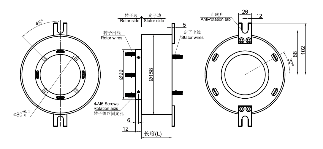GT80158系列整體式精密導電滑環,主要應用于360度連續旋轉且需要保證電源,信號不能中斷的場合:多用于醫療器械、紡織業設備、礦山工程機械、塑膠/硅膠制品生產設備、轉馬游樂設備、自動化生產設備、珍珠棉(E P)聚乙烯發泡塑膠機械設備、工業機器人、教育仿真設備、工程檢測儀器、金屬表面精整加工設備、自動拋光設備、機械手、造紙生產線、印刷機械設備、干燥機設備、熱熔膠涂布機、連續輸送機械設備、傳感器、電纜生產與 檢測設備等任意需要360°旋轉導電或傳輸各種控制信號的裝置。