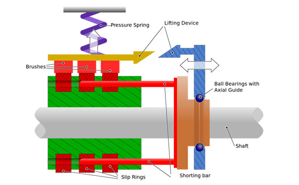 在稱為繞線轉子電動機的AC感應電動機的一種形式中,滑環不用于傳遞動力,而是用于將電阻插入轉子繞組中。繞線轉子電動機使用三個滑環 - 通常由銅或銅合金制成 - 安裝在電動機軸上(但絕緣)。每個滑環連接到三相轉子繞組中的一個。由石墨制成的滑環刷連接到電阻裝置,例如變阻器。當滑環與轉子一起轉動時,電刷保持與環的恒定接觸并將電阻傳遞給轉子繞組。
