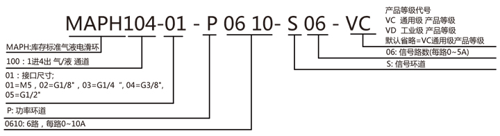 MAPH104-01, MAPH104-02 氣液電一體滑環選型表 1)XX=01 接口尺寸M5 Pipe size3~6mm 2)XX=02 接口尺寸G1/8 Pipe size3~10mm |