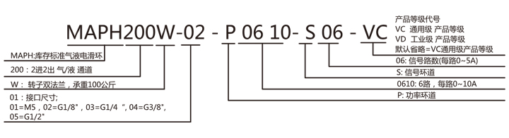MAPH200W-XX 氣液電一體滑環選型表 1)XX=01,接口尺寸=M5, 氣管規格3~6mm 2)XX=02,接口尺寸=G1/8,氣管規格3~10mm 3)XX=03,接口尺寸=G1/4,氣管規格3~12mm 4)XX=04,接口尺寸=G3/8,氣管規格3~16mm 5)XX=05,接口尺寸=G1/2,氣管規格3~20mm |