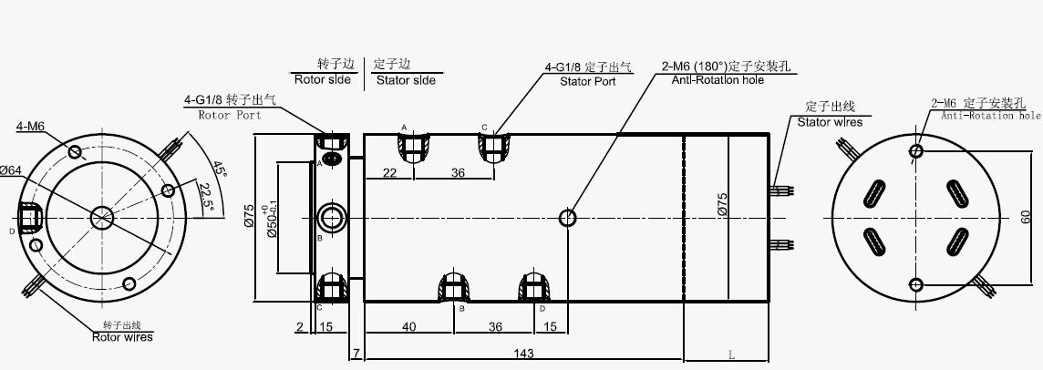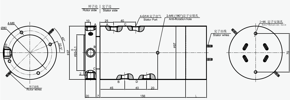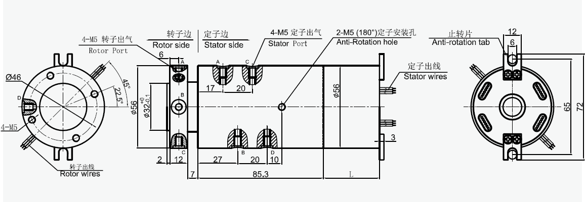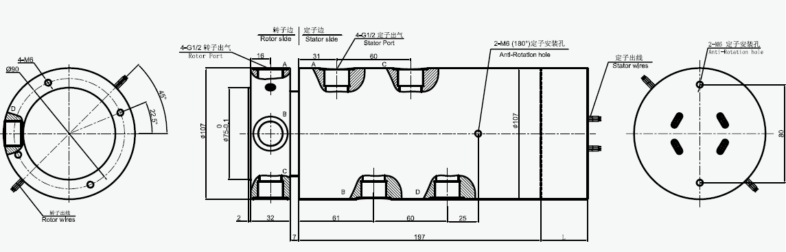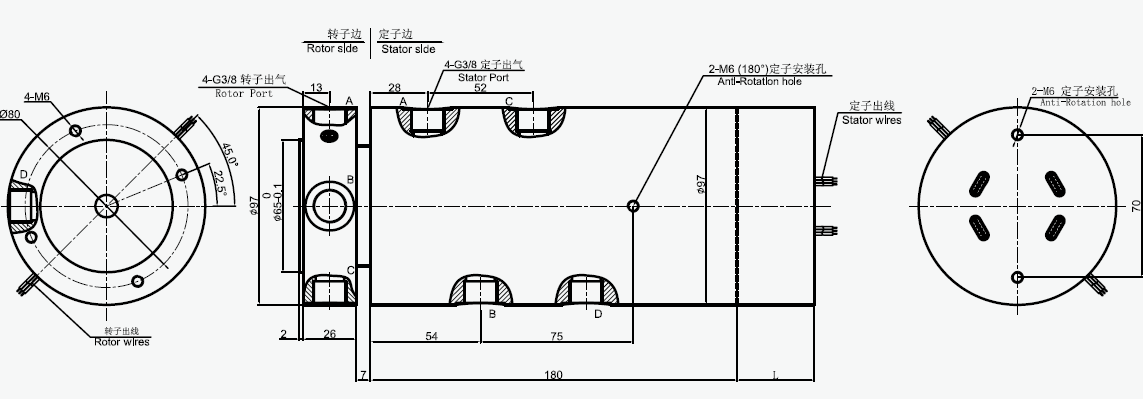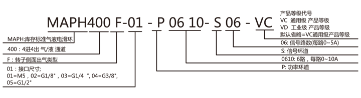 MAPH400F-XX 氣液電一體滑環選型表 1)XX=01,接口尺寸=M5, 氣管規格3~6mm 2)XX=02,接口尺寸=G1/8,氣管規格3~10mm 3)XX=03,接口尺寸=G1/4,氣管規格3~12mm 4)XX=04,接口尺寸=G3/8,氣管規格3~16mm 5)XX=05,接口尺寸=G1/2,氣管規格3~20mm |