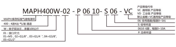 MAPH400W-XX 氣液電一體滑環(huán)選型表 1)XX=01,接口尺寸=M5, 氣管規(guī)格3~6mm 2)XX=02,接口尺寸=G1/8,氣管規(guī)格3~10mm 3)XX=03,接口尺寸=G1/4,氣管規(guī)格3~12mm 4)XX=04,接口尺寸=G3/8,氣管規(guī)格3~16mm 5)XX=05,接口尺寸=G1/2,氣管規(guī)格3~20mm |