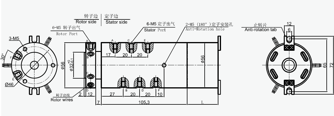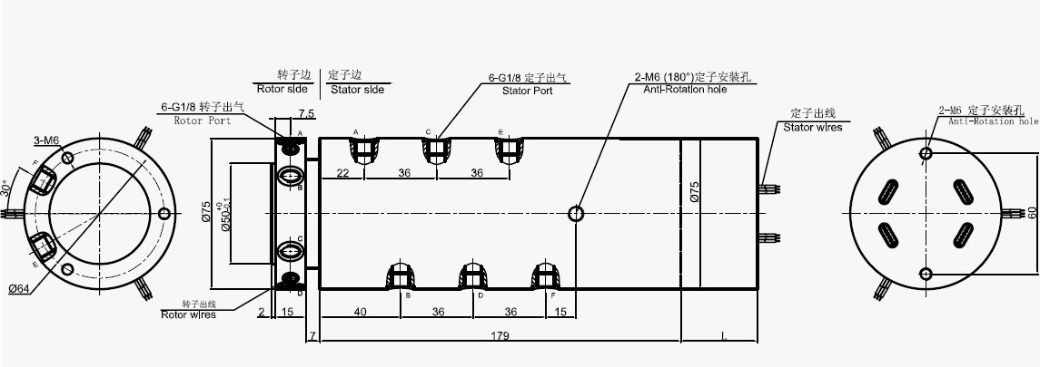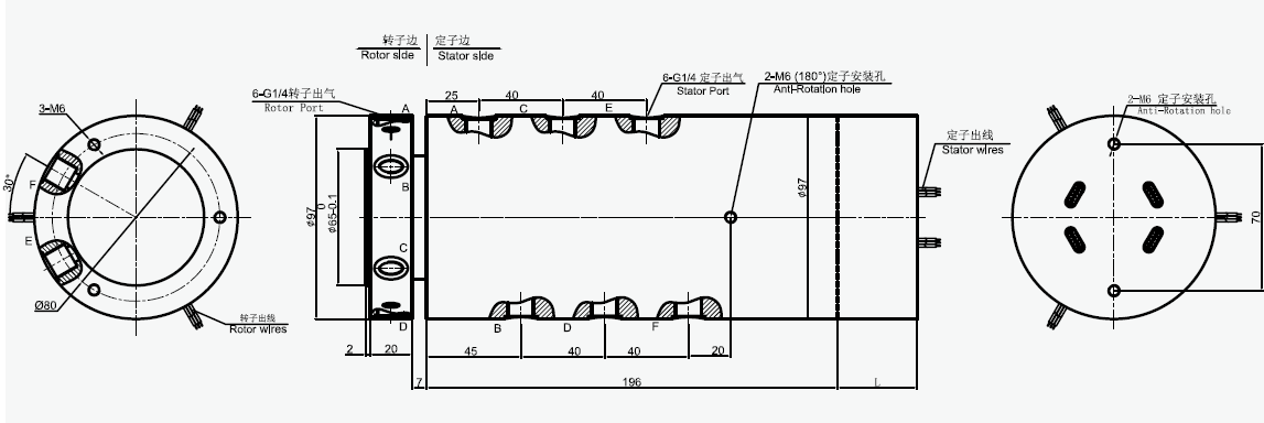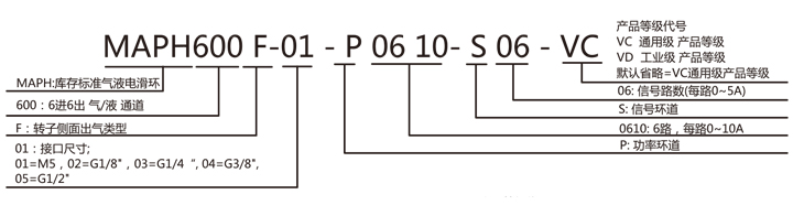 MAPH600F-XX 氣液電一體滑環選型表 1)XX=01,接口尺寸=M5, 氣管規格3~6mm 2)XX=02,接口尺寸=G1/8,氣管規格3~10mm 3)XX=03,接口尺寸=G1/4,氣管規格3~12mm |